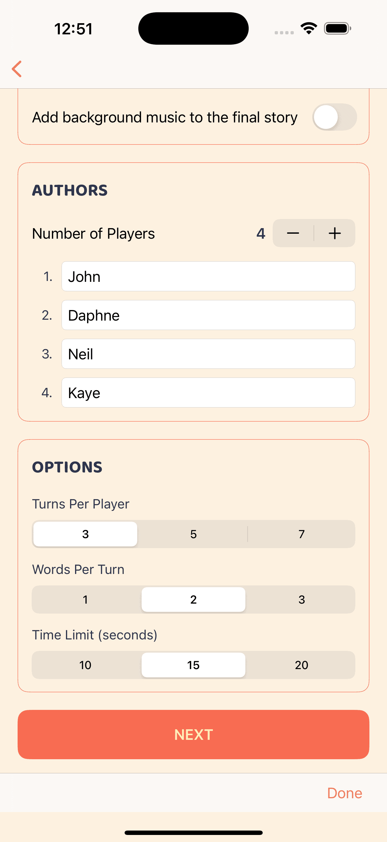 You Said What? is a party storytelling game for 2–8 players. Each player is given one or more random words (and sometimes a twist) and has a short time to record a sentence that fits into the ongoing story. Once everyone has had their turns, the app stitches the recordings together so you can listen back to the unpredictable tale you’ve just created.
