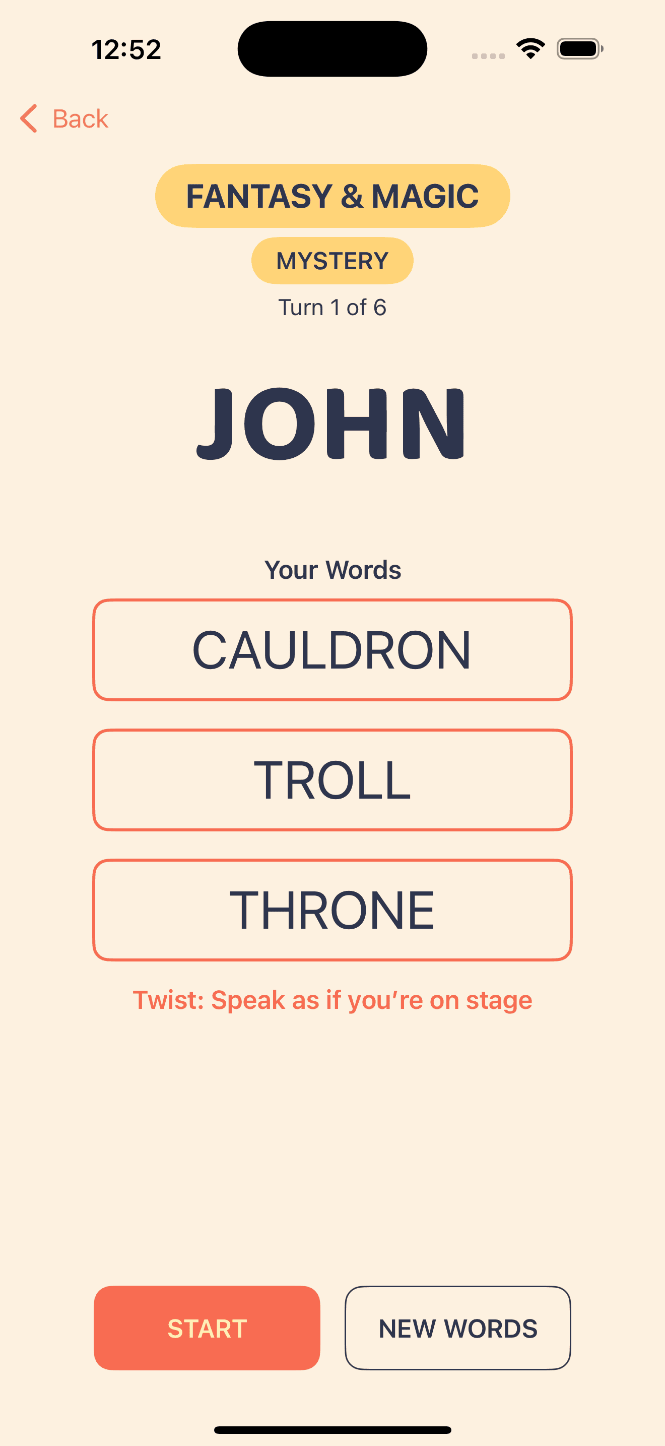 Classic Mode – Take your turn, see your words and twist, then record your sentence. You’ll have time to think, and you can even re-record if you want a better take.