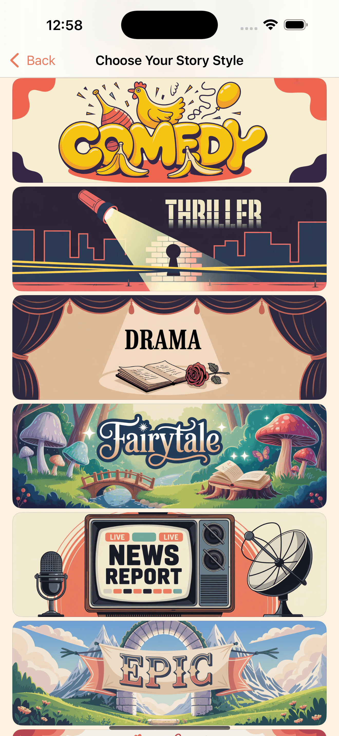 • Story genres including Comedy, Thriller, Romance, Mystery, and more